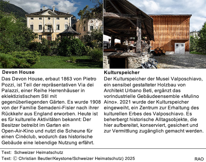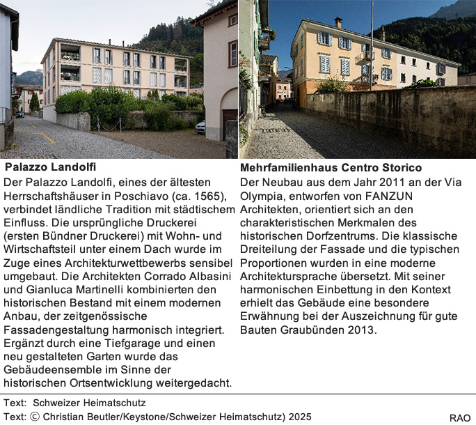 Poschiavo nutzt seine periphere Lage als Chance und verbindet Eigenständigkeit, Baukultur und nachhaltige Entwicklung zu einem zukunftsweisenden Modell für Bergregionen. Historische Gebäude und zeitgenössische Architektur, innovative Projekte, sowie ein vielfältiges Kulturangebot schaffen Lebensqualität und wirken der Abwanderung entgegen. Der Schweizer Heimatschutz würdigt Poschiavo mit dem Wakkerpreis 2025 als Vorbild für das gelungene Zusammenwirken von Tradition, Fortschritt und Gemeinschaftssinn.