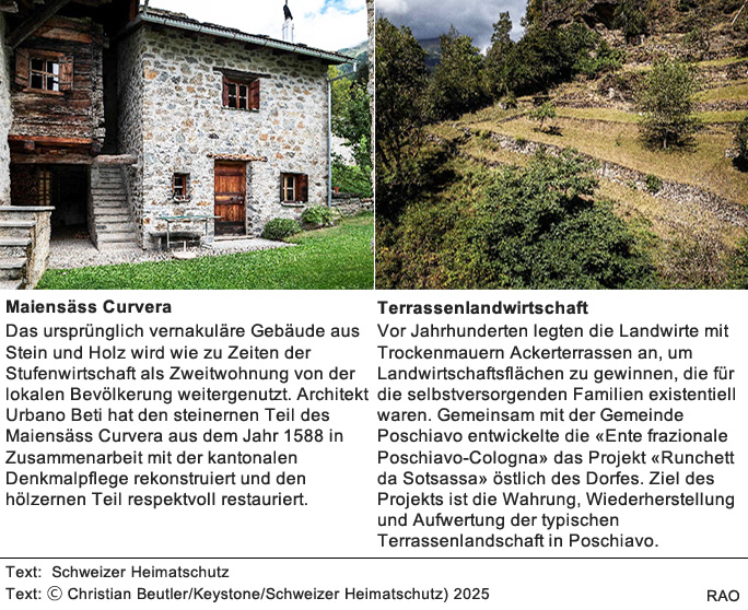 Poschiavo ist ein Vorbild für den umsichtigen Umgang mit Baukultur. Die Gemeinde hat ihren historischen Bestand sorgfältig inventarisiert und Baureglemente entwickelt, die eine qualitativ hochwertige Instandhaltung und Weiterentwicklung garantieren. Neue Bauten orientieren sich an den traditionellen Grundsätzen, um das Ortsbild zu erhalten. Auch ausserhalb des Dorfzentrums lebt die Verbindung von Kultur und Natur: Die traditionellen Maiensässe, einst wichtige Elemente der Stufenwirtschaft, werden weiterhin genutzt und gepflegt.