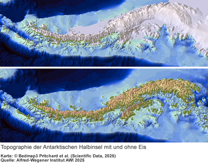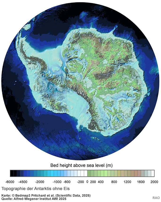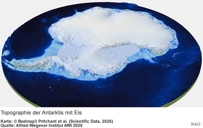 Die bisher detaillierteste Karte der Landschaft unter dem Eisschild der Antarktis wurde von einem Team internationaler Wissenschaftler unter der Leitung des British Antarctic Survey (BAS) und mit Beteiligung des Alfred-Wegener-Instituts erstellt. Die Karte mit dem Namen Bedmap3 umfasst mehr als sechs Jahrzehnte an Vermessungsdaten, die mit Flugzeugen, Satelliten, Schiffen und sogar Hundeschlitten gesammelt wurden. Die Ergebnisse werden diese Woche in der Zeitschrift Scientific Data veröffentlicht.
