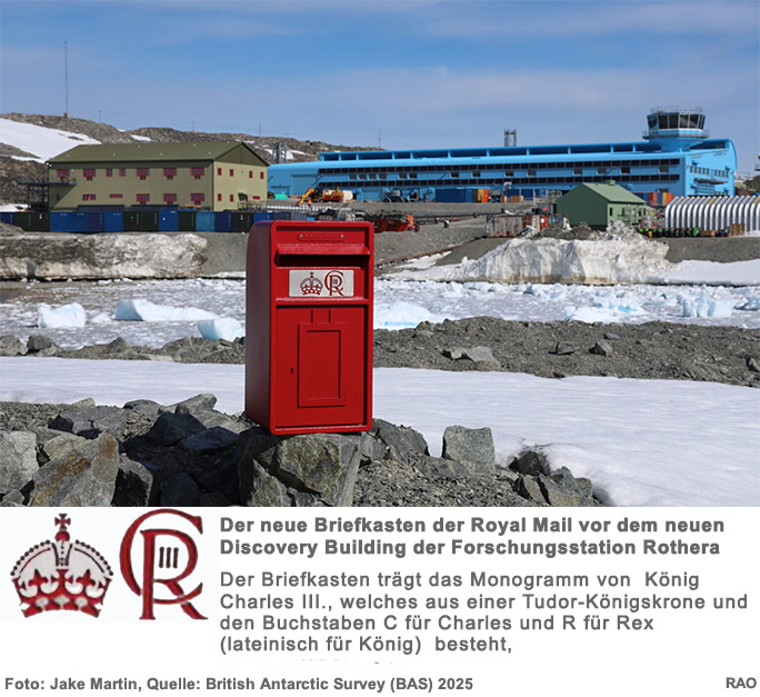Die Mitarbeiter der britischen Rothera Forschungsstation in der Antarktis haben einen ikonischen Royal Mail-Briefkasten mit der König Charles III.-Monogramm, welches aus einer Tudor-Königskrone und den Buchstaben C für Charles und R für Rex (lateinisch für König)besteht,pünktlich zu Weihnachten erhalten.