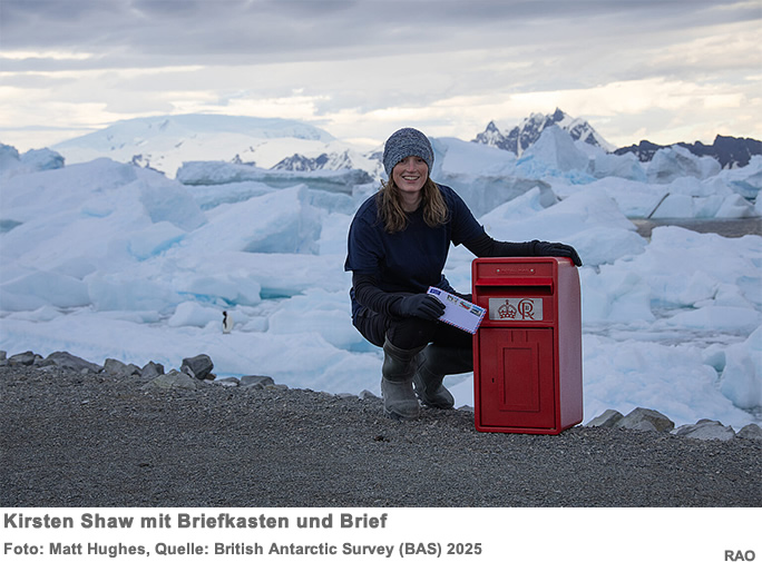 Die Aufrechterhaltung eines Postdienstes im britischen Antarktisgebiet ist weit mehr als eine symbolische Geste. Es stärkt die Präsenz und das Erbe Grossbritanniens in der Antarktis und bietet eine wichtige Verbindung zur Welt. Es ist eine Freude, diesen glänzenden neuen Briefkasten im neuen Discovery Building in Rotheras Postamt installiert zu sehen.“