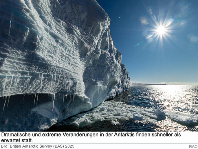 Professor Dame Jane Francis, Direktorin des British Antarctic Survey (BAS), eröffnet das zweitägige Treffen und erinnert das Publikum daran: ""Was in der Antarktis passiert, betrifft uns alle."" Warum die Antarktis für uns alle wichtig ist ● Extremes Wetter: Der Südliche Ozean um die Antarktis absorbiert den grössten Teil der überschüssigen Wärme, die durch Treibhausgasemissionen verursacht wird. Dies treibt bereits stärkere Stürme, Hitzewellen und Niederschläge weltweit an, die das Leben weit über die Polarregionen hinaus stören. ● Verlust von Ökosystemen: Entscheidende Arten wie Krill - das Zentrum der antarktischen Nahrungskette - und Tiefseekorallen- und Schwammlebensräume sind bedroht. Diese Ökosysteme unterstützen die Fischerei, die biologische Vielfalt und regulieren sogar das Kohlenstoffgleichgewicht des Planeten. ● Steigende Meere: Wenn antarktische Eisschilde wichtige Schwellenwerte überschreiten, könnte der Meeresspiegel in den kommenden Jahrhunderten um mehr als 10 Meter steigen und Küstenstädte, Gemeinden und Infrastruktur auf der ganzen Welt, einschliesslich Grossbritanniens, bedrohen. ● Ein Blick in die Zukunft: Beweise aus der Vergangenheit zeigen, dass sich der Wandel aus der Antarktis schnell ausbreiten kann, manchmal innerhalb von Jahrzehnten, mit potenziell verheerenden Folgen weltweit.