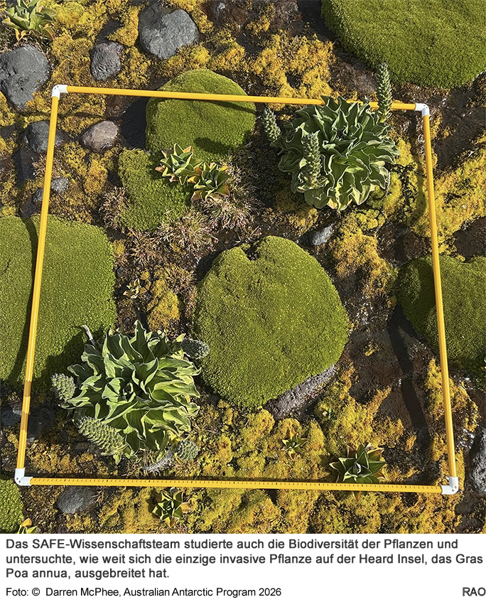 Von einem Camp am Skua Beach aus untersuchte das Team von Securing Antarctica's Environmental Future (SAEF) die Vegetation von Heard Island, wirbellose (hauptsächlich Käfer und Springschwänze) und nahm Seewasserproben.