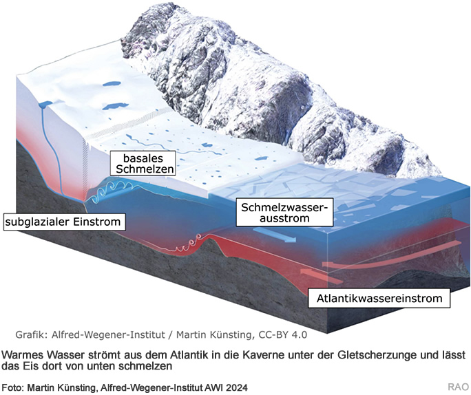 Ein Studienteam des Alfred-Wegener-Instituts kann nun erklären, warum. Mithilfe eines Computermodells konnten sie zeigen, dass warmes Wasser aus dem Atlantik in das Europäische Nordmeer und schliesslich in die Kaverne unter der Gletscherzunge strömt und das Eis dort von unten schmilzt. Die nun im Fachmagazin Nature Communications veröffentlichten Erkenntnisse legen die Basis für genauere Prognosen zur Zukunft des grönländischen Eisschildes und zum weiteren Anstieg des globalen Meeresspiegels als Folge der globalen Erwärmung.