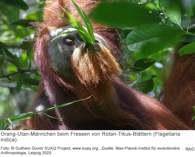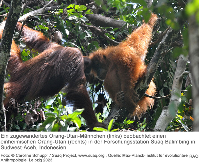 Neu in eine Region eingewanderte, männliche Orang-Utans auf Borneo und Sumatra beobachten einheimische Artgenossen und lernen von ihnen, welche ihnen unbekannten Nahrungsmittel sie konsumieren können. Das hat ein internationales Forschungsteam unter der Leitung der Universität Leipzig und des Max-Planck-Institut für evolutionäre Anthropologie in Leipzig in einer Langzeitstudie mit 152 männlichen Tieren über einen Zeitraum von 30 Jahren herausgefunden. Dieses Beobachten war am häufigsten zu beobachten, wenn Einheimische seltene oder schwer zu verarbeitende Nahrungsmittel zu sich nahmen.