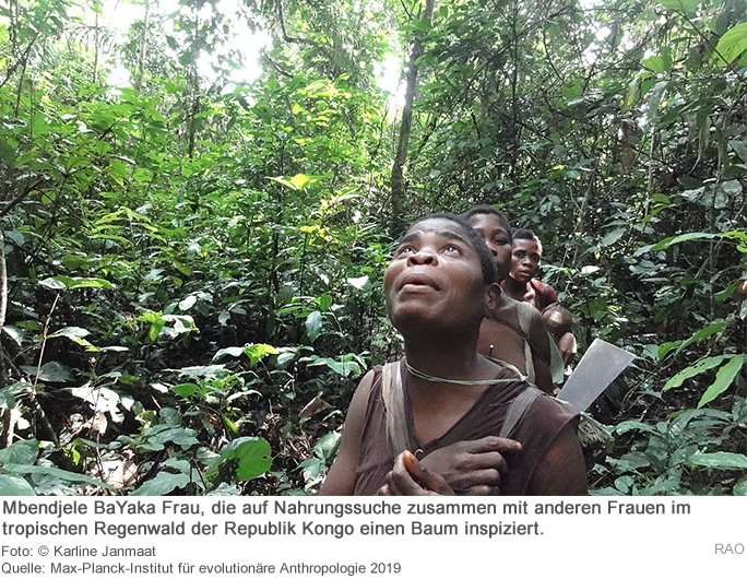 Wie beeinflussen beispielsweise ein grosser Aktionsradius und ein Wegesystem wie Menschen zum Ziel gelangen? Forscher des Max-Planck-Instituts für evolutionäre Anthropologie in Leipzig untersuchten, wie sich die Mbendjele BaYaka in der Republik Kongo und freilebende Schimpansen in der Elfenbeinküste durch den Regenwald fortbewegen. Ähnlich wie die Jäger und Sammler bewegen sich auch die Schimpansen in einer geraden Linie auf ein Ziel zu, doch in Abhängigkeit von der Gruppengrösse und Ortskenntnis unterscheiden sich Geradlinigkeit und Geschwindigkeit bei Menschen und Schimpansen deutlich.