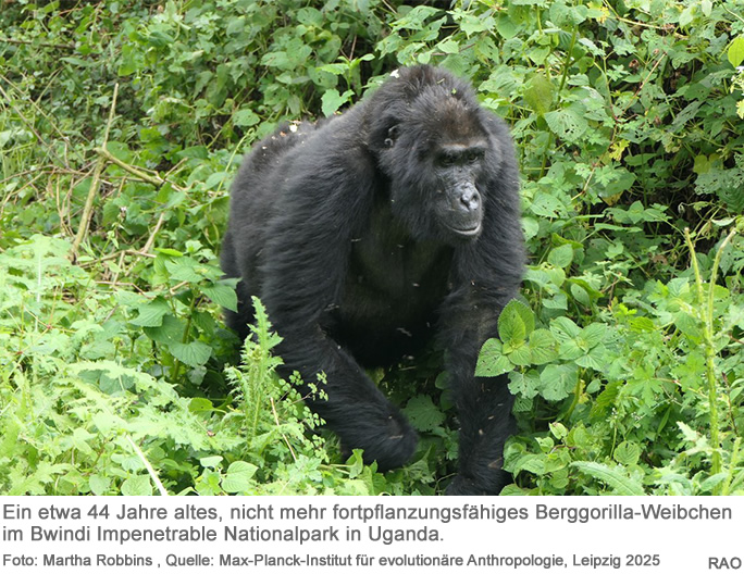 Neue Forschungsergebnisse des Max-Planck-Instituts für evolutionäre Anthropologie in Leipzig und der Universität Turku in Finnland zeigen, dass weibliche Berggorillas ähnlich wie Menschen und einige andere Säugetiere auch nach der Geburt ihres letzten Nachwuchses noch lange leben können. Die auf über drei Jahrzehnten Lebensgeschichts- und Verhaltensdaten basierende Studie zeigt, dass sich fast ein Drittel der erwachsenen Berggorilla-Weibchen aus vier freilebenden Gruppen im Bwindi-Impenetrable-Nationalpark in Uganda nicht mehr fortpflanzt, anschliessend aber noch mehr als ein Jahrzehnt weiterlebt und mindestens ein Viertel ihres Erwachsenenlebens in der sogenannten postreproduktiven Phase verbringt. Diese Erkenntnis ergänzt unser Verständnis der Evolutionsgeschichte der Hominiden wesentlich.