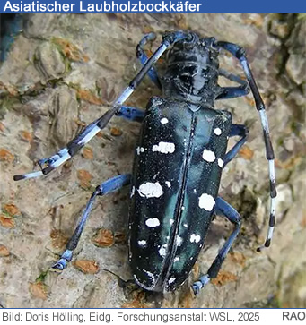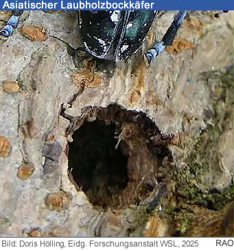 Zur Erinnerung: Der Asiatische Laubholzbockkäfer ist ein exotischer Schadorganismus, der für Laubbäume, selbst für gesunde, besonders gefährlich ist und der Bekämpfungspflicht unterliegt.