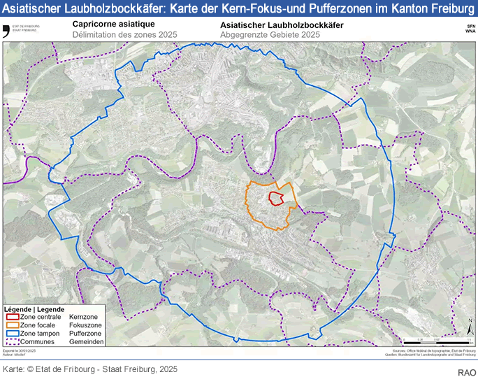 Die Analysen des Asiatischen Laubholzbockkäfers, der im Herbst 2024 in Marly gefunden wurde, zeigen, dass es sich bei dem Insekt um einen Nachkommen des Befalls handelt, der 2014 festgestellt wurde. Weitere Individuen befinden sich in der Region und die Pufferzone wird daher ausgeweitet. Phytosanitäre Fällungen werden in der Kernzone durchgeführt.