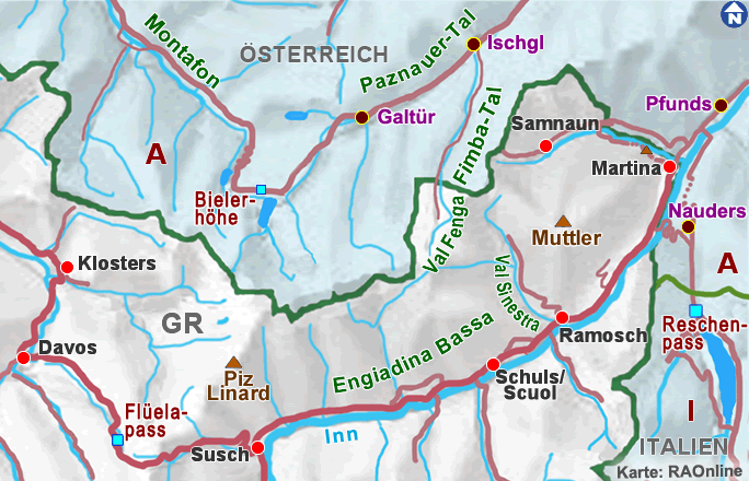 Das Talende des Fimba-Tals, einem Nebental des Paznauner-Tals im österreichischen Bundesland Tirol liegt in der Schweiz. Im rätoromanischen Sprachteil der Schweiz nennt man das Fimba-Tal auch Val Fenga (Feng-Tal). Das schweizerische Val Fenga ist von Ischgl in Österreich her über eine Strasse erschlossen. Von Ramosch im Unterengadin aus gelangt man zu Fuss durch das Val Sinestra und anschliessend über den auf 2'609 m ü.M. liegenden Pass Cuolmen da Fenga (Fimber-Pass) ins Val Fenga.