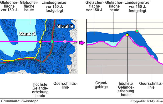 | Schmelzende Getscher verändern die Landschaft. Auf dem Eis festgelegte Grenzlinien befnden sich nach der Eisschmelzeauf dem blanken Fels an einer anderen Stelle. Die Staatsfläche der Schweiz wurde oberhalb von Zermatt grösser. |