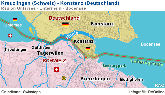 Die Grenzlinie zwischen der Schweiz und Deutschland auf dem Schweizer Ufer des Bodensees ist rund 3 km lang. Die Grenze trennt die beiden Städte Konstanz in Deutschland (Bundesland Baden-Württemberg) und Kreuzlingen (Kanton Thurgau) in der Schweiz.
