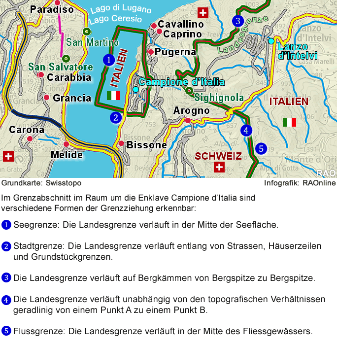 | Das Gebiet der Ortschaft Campione d'Italia am Lago Cerosio (= Lago di Lugano = Luganersee) ist vollständig von Schweizer Boden umgeben. Die Zufahrt erfolgt über Schweizer Gebiet. |