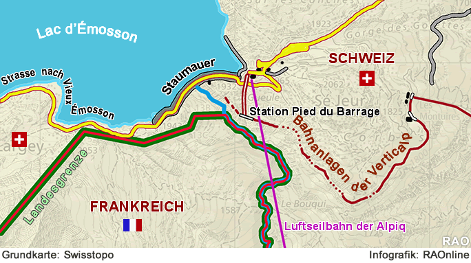 | Staumauer liegt auf Schweizer Staatsgebiet. Der Verlauf der Landesgrenze zwiscen der Schweiz und Frankreich wurde in einem Staatsvertrag so geregelt, dass die Staumauer und die Zufahrtsmöglichkeiten zum Bauwerk (Luft- und Standseilbahn) sowie die Strasse zur weiter oben liegenden Staumauer beim Lac du Vieux Émosson vollständig auf Schweizer Boden liegt. Mit dem Wasser der beiden Stauseen wird elektrischer Strom im Pumpspeicherkraftwerk Nant de Drance sowie in Kraftwerken unten im Tal in der Region von Châtelard erzeugt. |