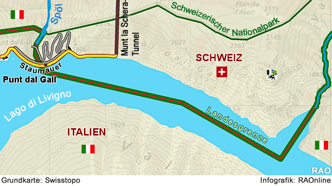 | Die Staumauer des Lago Livigno liegt je zu Hälfte in der Schweiz und in Italien. Ein kleine Fläche am Nordende des Stausee wurde der Schweiz zugewiesen. Der Ausfluss aus dem Stausee erfolgt durch den Fluss Spöl, welche vollständig auf Schweizer Staatgebiet liegt. Die Zufahrt zur Staumauer erfolgt auf der Schweizer Seite von der Zollstation Punt la Drossa her durch den Munt la Schera-Tunnel. Die Stromprduktion geschieht im Schweizer Speicherkraftwerk Ova Spin. |