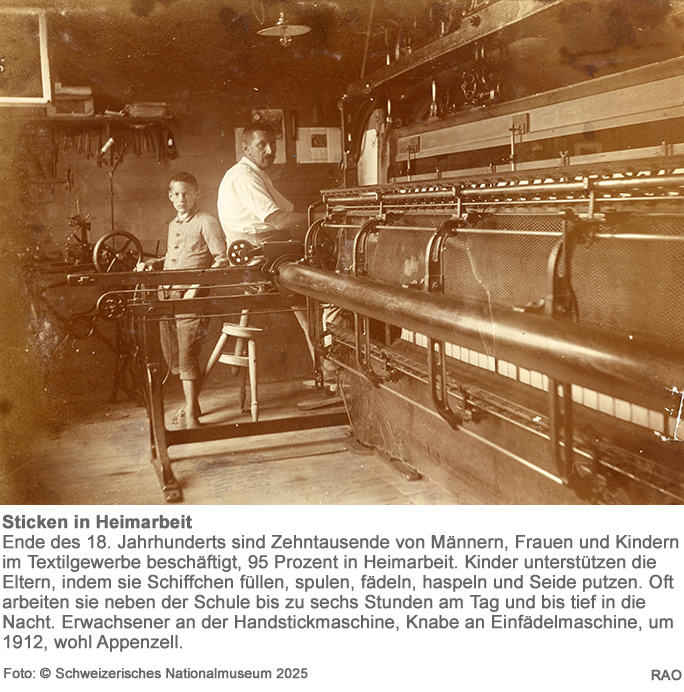 Kinderarbeit war ein fester Bestandteil des Alltags, noch bevor Fabriken die Landschaft prägten. Weil das Einkommen der Eltern nicht reichte, mussten Kinder zum Überleben der Familie beitragen und arbeiteten im Haushalt, auf dem Hof oder in der Heimarbeit mit. Während dies einerseits auch Teilhabe bedeutete, wurde die Arbeit von Kindern mit der industriellen Revolution vermehrt ausgebeutet: In stickigen Textilfabriken, beim Spulen und Weben, in der Seidenindustrie oder in den Glarner Stoffdruckereien arbeiteten selbst Sechsjährige unter gefährlichen Bedingungen - oft bis zu 16 Stunden am Tag.