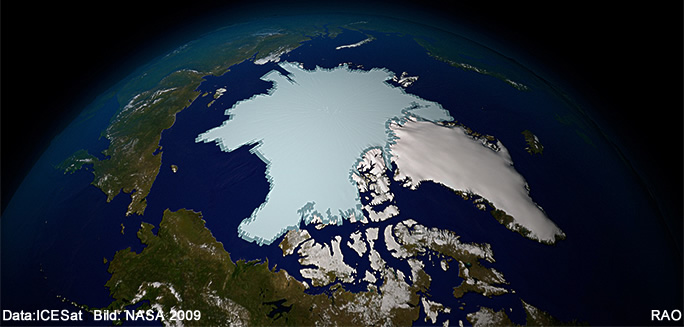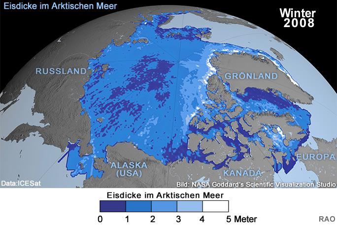 | Der NASA Satellit ICESat misst über dem Arktischen Meer die Eisdecke und das Eisvolumen. Mit dem Datenmaterial werden Trends berechnet. Die Messungen zeigen gegenwärtig einen Trend zur Abnahme des Volumens und der Dicke von mehrjährigem Eis und eine Zunahme des Eisvolumens von einjährigem Eis. Der Trend der Eisdicke von einjährigem, neu gebildetem Meereis ist uneinheitlich. |