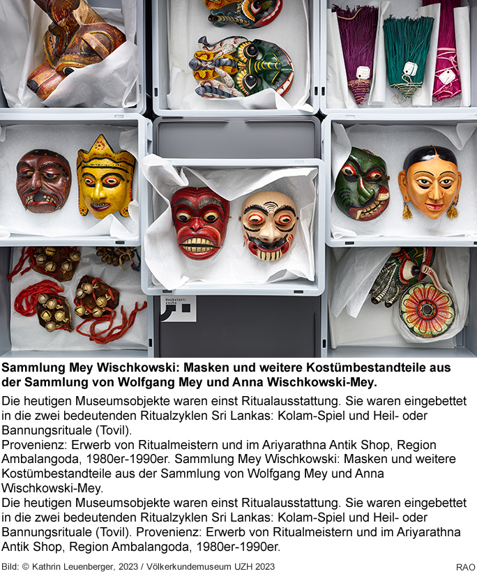 Die Sammlung des deutschen Ethnologenpaars Wolfgang Mey und Anna Wischkowski-Mey umfasst mehr als 700 Objekte - Ritualmasken und weitere Kostümteile sowie Ritualgegenstände aus Sri Lanka, gesammelt über zwei Jahrzehnte (1984 bis 2006). Sie wurde erst vor kurzem angekauft, was in der Ausstellung gewollt erkennbar ist: Viele Objekte liegen noch in Kisten, die sich im hinteren Teil des Ausstellungsraums stapeln. |