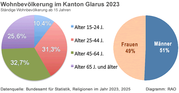 | 2023 bekannten sich im Kanton Glarus 29,1% der Wohnbevölkerung ab dem 15. Altersjahr zum evangelisch-reformierten Glauben, 26,8% zum römisch-katholischen Glauben und 9,4% zum islamischen Glauben. 27,1% gaben an, keiner Glaubensgemeinschaft anzugehören. Im gleichen Jahr bekannten sich in der Schweiz 31% zum römisch-katholischen Glauben , 19% zum evangelisch-reformierten Glauben und 36% der Wohnbevölkerung ab dem 15. Altersjahr waren ohne Religionszugehörigkeit. |