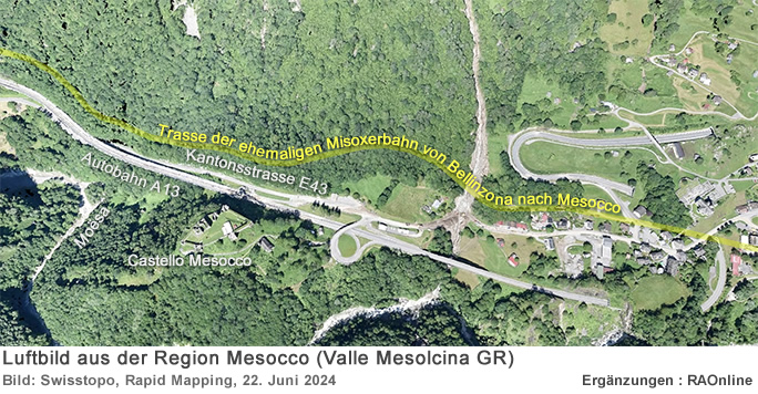 Der Pfad umging das heutige Dorf Dorf San Bernardino auf der östlichen Talseite des Valle Mesolcina. Bei San Giacomo überquerte der Weg den Fluss Moësa. Der Römerweg blieb auf der westlichen Talseite bis hinunter nach Bellinzona. Ab Mesocco verlief der Weg möglicherweise in der Nähe des Bahnstrecke der späteren Misoxerbahn (Ferrovia Mesolcinese), welche der Betrieb 2003 endgültig eingestellt wird. Die Bahntrasse wurde danach teilweise wieder zurückgebaut.