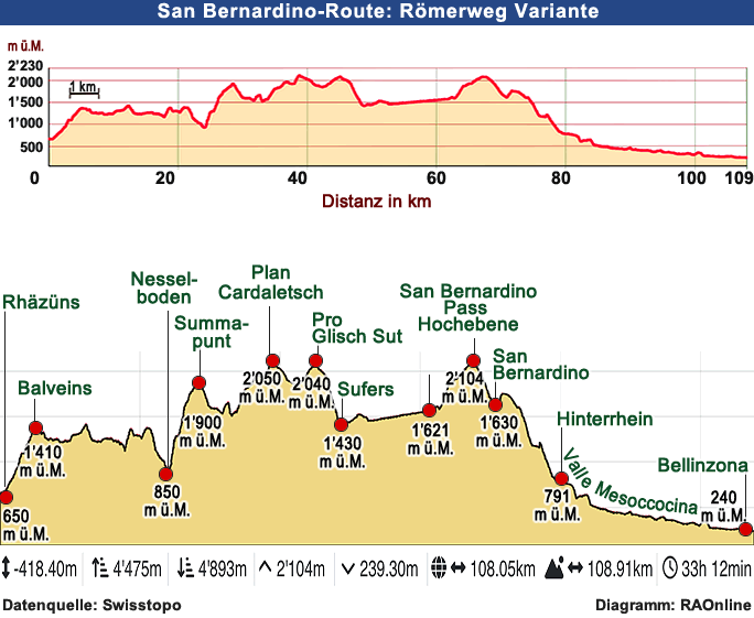 Von Sufers aus verlief der Pfad am Fluss Hinterrhein entlang über Medels und Nufenen bis nach Splügen und weiter nach Hinterrhein, wo der Fluss überquert wurde. Oben auf dem San Bernardinopass folgte der Römerweg dem Fuss des Piz Uccello rund 1 km östlich der heutigen Passstrasse.