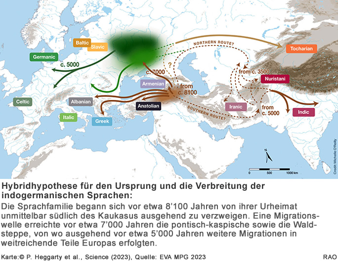 Hybridhypothese für den Ursprung und die Verbreitung der indogermanischen Sprachen: Die Sprachfamilie begann sich vor etwa 8'100 Jahren von ihrer Urheimat unmittelbar südlich des Kaukasus ausgehend zu verzweigen. Eine Migrationswelle erreichte vor etwa 7'000 Jahren die pontisch-kaspische Steppe sowie die Waldsteppe, von wo ausgehend vor etwa 5'000 Jahren weitere Migrationen in weitreichende Teile Europas erfolgten.