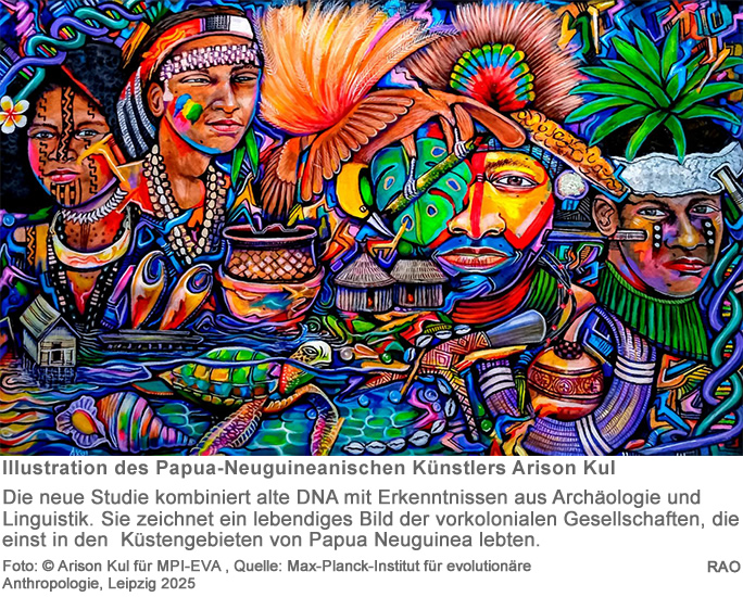 Eine neue Studie zeigt die zentrale Bedeutung der regionalen Ausbreitung und lokalen Interaktionen an der Küste Papua-Neuguineas. ● 2'500 Jahre Menschheitsgeschichte in Papua-Neuguinea: Die ersten alten Genome aus Papua-Neuguinea und dem Bismarck-Archipel erweitern durch den genetischen Blickwinkel unser Verständnis früher Migrationen über den Ozean und wie Menschen im Pazifik in der Vergangenheit interagierten. ● Unterschiedliche Einflussbereiche damals und heute: Verschiedene kulturelle und genetische Gruppen lebten über lange Zeiträume hinweg nebeneinander, ohne sich zu vermischen. Das heutige Mosaik verschiedener Sprachen und Kulturen entstand vermutlich schon vor 650 Jahren, als sich Netzwerke nach einer Zeit schwieriger Umweltbedingungen neu sortierten. Die Studie gibt neue Einblicke in die komplexe Besiedlungsgeschichte dieser frühen Gemeinschaften und regionale Unterschiede. ● Interdisziplinärer Ansatz: Die Kombination von alter DNA und Erkenntnissen aus Archäologie und Linguistik liefert ein ganzheitlicheres Bild davon, wie Genetik, Kultur und Umwelt die reiche Vielfalt der Gesellschaften im Pazifik beeinflusst haben.
