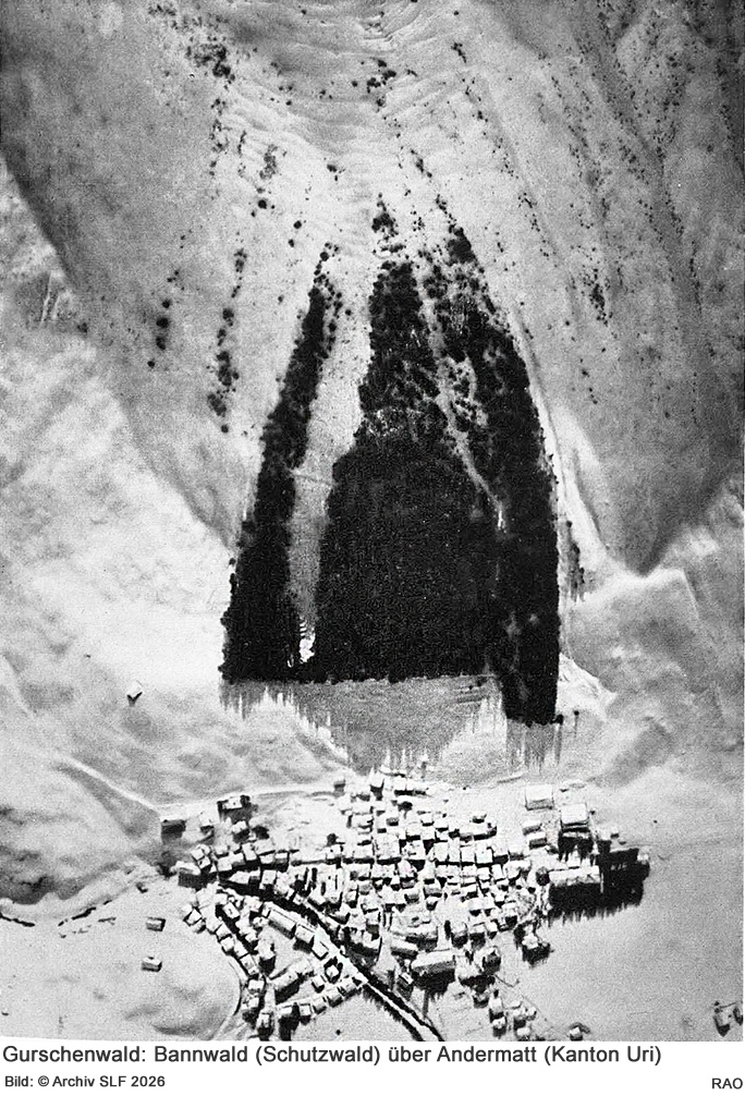 «Die Anbrüche vollzogen sich auch an Orten, wo seit Menschengedenken keine Lawinen beobachtet wurden», steht in der Dokumentation der viertägigen, wissenschaftlichen Tagung, die das Institut für Schnee- und Lawinenforschung SLF im Oktober 1952 in Davos durchführte. Thema war der «Lawinenwinter 1950/51 und die daraus ergebenen Folgerungen für Lawinenverbauungen». 98 Menschen kamen damals ums Leben, wobei «einige der Toten hätten verhindert hätten können, wenn Schutzwald dort gestanden hätte, wo von Natur aus Schutzwald stehen könnte», ordnet SLF Schutzwald-Experte Peter Bebi ein.