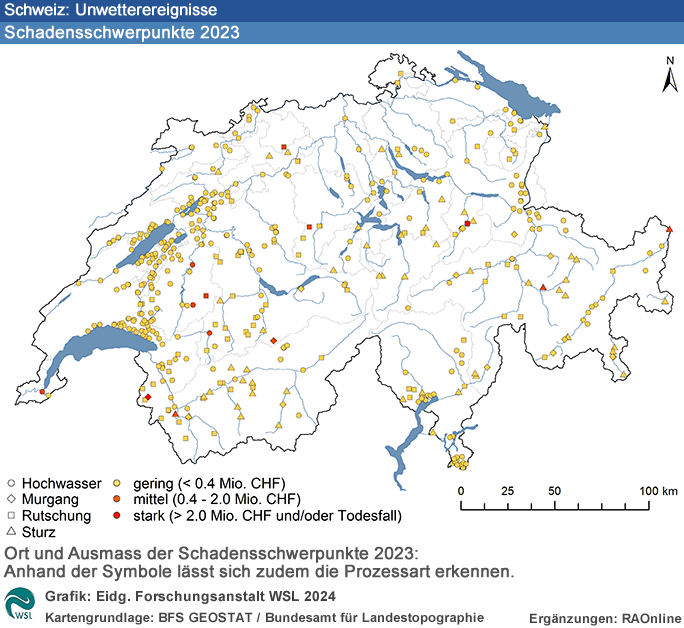 Lokal kam es im Jahr 2023 zu grossen Schäden, schweizweit betrachtet war 2023 im Vergleich zum langjährigen Mittel und Median jedoch ein eher schadenarmes Jahr. Nicht zuletzt dank guter Präventionsmassnahmen gab es 2023 erfreulicherweise keine Todesopfer durch Hochwasser, Murgänge, Rutschungen und Sturzprozesse. In der 52-jährigen Beobachtungsreihe rangiert das Jahr 2023 mit einer Schadenssumme von 75 Millionen Franken auf Platz 37. Der grösste Teil der geschätzten Schadenskosten (rund 66 %) entstand durch Rutschungen, gefolgt von Hochwasser (21 %), Steinschlag und Felssturz (7 %) und Murgängen (6 %). Ursache waren vor allem Dauerregen (67 %) und Regen in Kombination mit Schneeschmelze (18 %).