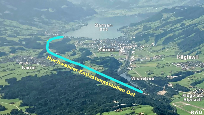 Das Einlaufbauwerk des Hochwasserentlastungsstollens liegt am rechten Ufer des Sarnersees in der Nähe der Mündung der Grossen Melchaa in Sachseln. 6,5 km lang führt der Stollen mit einem Gefälle von 2,14 ‰ unterhalb der östlichen Tal-flanke des Sarneraatals bis um den Wichelsee herum zum Auslaufbauwerk in Alp-nach. Mit dem Durchschlag ist der Stollen nun fertig ausgebrochen.