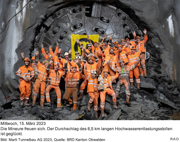 Die Wohnbevölkerung im Sarneraatal wünscht sich dringend einen besseren Hochwasserschutz. Das neue Stollenbauwerk wird zu einer wesentlichen Verbesserung beitragen. Inbetriebnahme 2026 bleibt realistisch Nach dem Durchschlag demontieren die Mineure in den kommenden Monaten die Tunnelbohrmaschine und bauen die Vortriebseinrichtungen zurück. Anschliessend beginnt der Innenausbau mit Spritzbeton. Noch immer fliesst aus den Karststrukturen des Schrattenkalks Wasser in den Stollen. Der kumulierte Wasserzutritt schwankt niederschlagsabhängig zwischen 400 450 l/s. Zur dauerhaften Auskleidung sind zusätzliche bauliche Massnahmen in den Bereichen der Karstöffnungen und Wasserzutritten vorgesehen. Die Auskleidungsarbeiten erstrecken sich bis Spätsommer 2024. Nach Abschluss des Stollenbaus folgt der Bau der Einund Auslaufbauwerke inklusive Stahlwasserbau mit den Regulierorganen und der Leittechnik. Baudirektor Josef Hess hält fest: "Das Ziel, den Stollen auf die Hochwassersaison 2026 in Betrieb zu nehmen, bleibt realistisch."