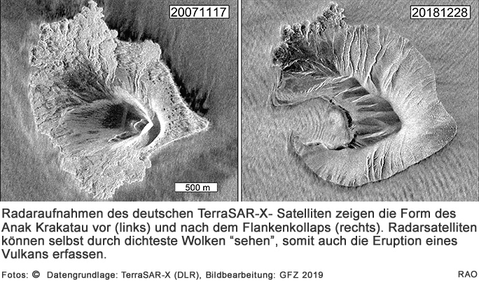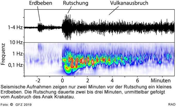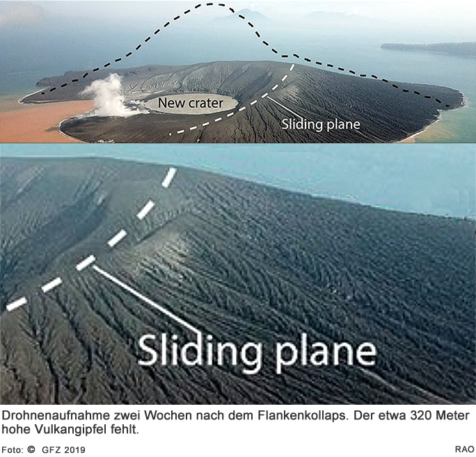 Vulkaninseln wie Anak Krakatau bestehen häufig aus nicht sehr stabilem Material. Ein Kollaps von Vulkanflanken kommt daher auf diesen Inseln immer wieder vor, wurde aber bislang nicht exakt vermessen. "Wir konnten am Krakatau nun zum ersten Mal genauestens beobachten, wie der Abbruch einer solchen Vulkanflanke vonstattenging und welche Signale diesen ankündigten", erklärt Thomas Walter, Vulkanologe am GFZ. In ihrer Studie am Anak Krakatau konnten die Forschenden beispielsweise zeigen, dass die Bewegung der Südostflanke über Monate in Richtung Meer eine Art Rutschbahn ausbildete. Das plötzliche beschleunigte Abrutschen der Flanke ins Meer, der sogenannte Flankenkollaps, habe nur zwei Minuten gedauert, und sei durch Seismografen und Infraschall-Netzwerke gemessen worden noch bevor die ersten Ausläufer des Tsunami die Küsten erreicht hatten.