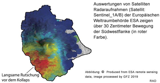 Ein internationales Forschungsteam unter der Führung von Thomas Walter vom Deutschen GeoForschungsZentrum GFZ in Potsdam hat nun gezeigt, dass der Vulkan vor seinem Zusammenbruch deutliche Warnzeichen aussendete. Das ergab die Auswertung einer grossen Menge unterschiedlicher Daten, die bei Messungen sowohl vom Erdboden als auch von Drohnen und Satelliten aus erhoben worden waren. Satellitendaten zeigten beispielsweise schon Monate vor der Katastrophe eine erhöhte Temperatur und Bodenbewegung an der südwestlichen Flanke. Zwei Minuten nach einem kleineren Erdbeben zeigten seismische Daten und niederfrequente Schallwellen dann das plötzliche Abrutschen eines grossen Teils des Vulkans. Dieser Kollaps löste schliesslich den tödlichen Tsunami aus. Die Forschenden wollen mithilfe der Analyse dieser komplexen Ereigniskaskade die Überwachung und Früherkennung bei anderen Vulkanen verbessern. Ihre Studie ist im Fachjournal Nature Communications erschienen.