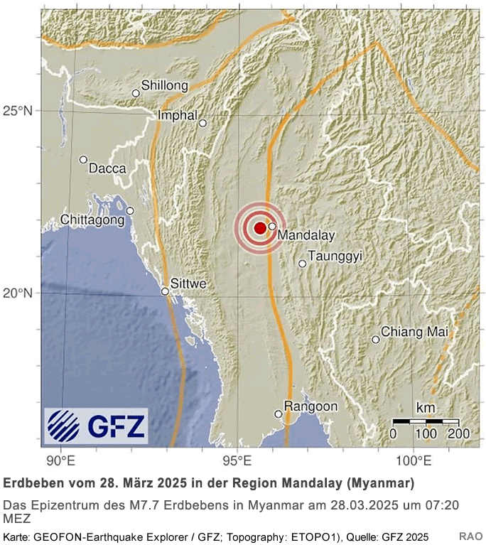 In der Nähe der 1,5 Mio Einwohner-Stadt Mandalay in Myanmar, hat sich ein Erdbeben der Magnitude von 7,7 ereignet. (Es ist damit ähnlich stark wie das türkisch-syrische Erdbeben im Februar 2023).