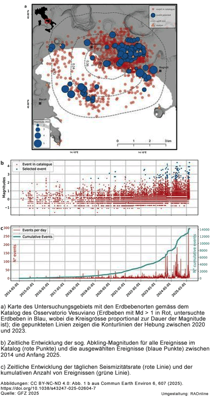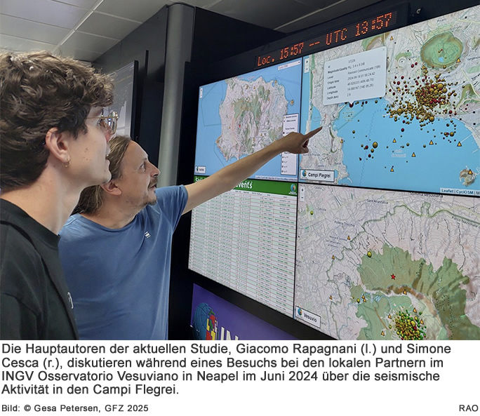 Nun hat ein internationales Team aus Forschenden des Istituto Nazionale di Geofisica e Vulcanologia (INGV), der Universität Pisa (Italien) und des GFZ Helmholtz-Zentrums für Geoforschung in Potsdam (Deutschland) vulkanisch-tektonische Erdbeben der letzten 10 Jahre in den Phlegräischen Feldern untersucht. Aus der Analyse der seismischen Wellenformen rekonstruierten die Forschenden die Geometrie der verschiedenen seismogenen Strukturen.