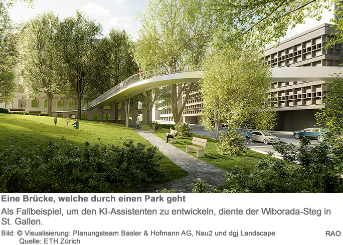 Als Fallbeispiel, um ihren KI-Assistenten zu entwickeln, nutzten die Forschenden in Zusammenarbeit mit Kollegin Vera Balmer das Projekt einer Fussgängerbrücke in St. Gallen, die das Ingenieurunternehmen Basler und Hofmann zusammen mit Nau2 und dgj Landscapes bereits entworfen hatte. Diese Brücke, der sogenannte Wiborada-Steg, führt durch einen Park in der Altstadt und sollte möglichst keine der geschützten Bäume tangieren.