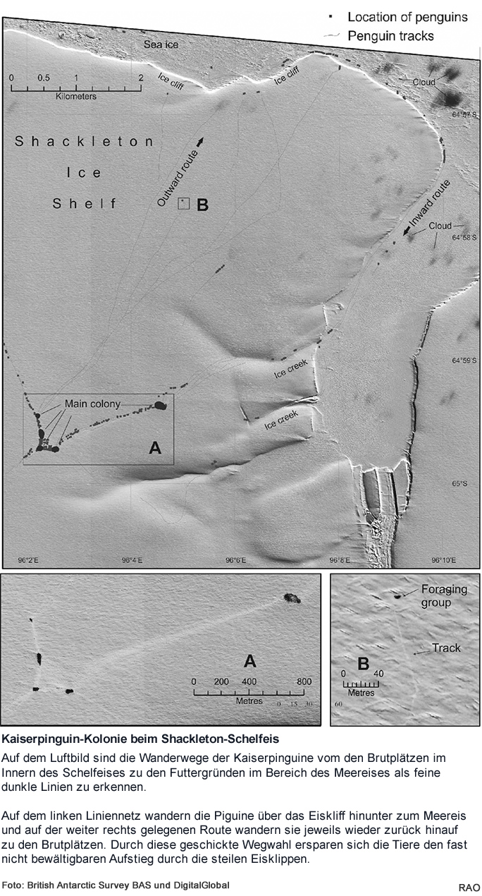 Die Hauptkolonie der Kaiserpinguine auf dem Shackletonschelfeis wählte für ihre Brutpflege eine Stelle auf der Hochfläche des Schelfeiskörpers aus, welche rund 6 km von der Schelfeiskante entfernt liegt und sich rund 20 m über der Meeresoberfläche befindet.