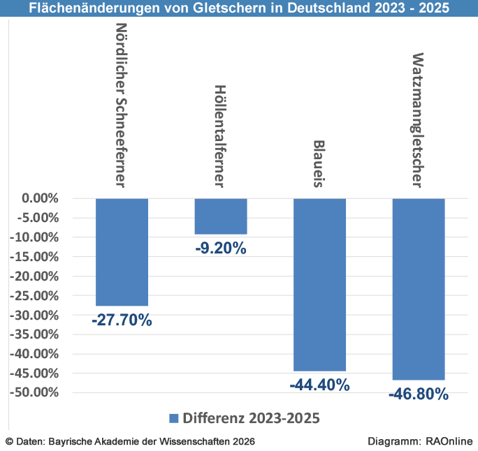 Die bayerischen Gletscher schmelzen in Rekordgeschwindigkeit: Aktuelle Vermessungen aus dem Herbst 2025 belegen, dass die Eisflächen seit 2023 mehr als ein Viertel ihrer Fläche eingebüsst haben. Gemeinsam mit der Hochschule München legt die Bayerische Akademie der Wissenschaften zum Weltgletschertag am 21. März 2026 aktuelle Daten vor, die den beschleunigten Rückgang der Gletscher dokumentieren.