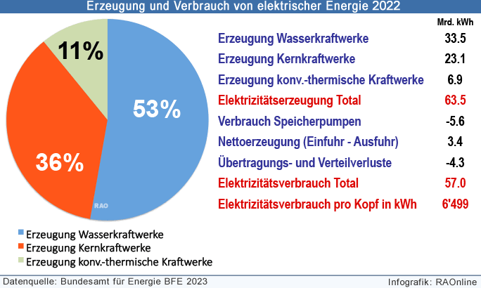 Im Jahr 2022 lag der Stromverbrauch in der Schweiz mit 57,0 Milliarden Kilowattstunden (Mrd. kWh) unter dem Niveau des Vorjahres (-1,9%). Die inländische Erzeugung (nach Abzug des Verbrauchs der Speicherpumpen) betrug 57,9 Mrd. kWh. Der physikalische Stromimportüberschuss lag bei 3,4 Mrd. kWh.