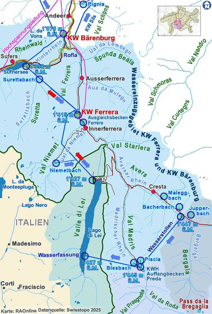 Aus dem Avers und dem Val Madrid, wo sich das Auffangbecken Preda befindet, wird Wasser in den Lago die Lei hochgepumpt. Das im Kraftwerk Ferrera turbinierte Wasser wird zum Sufersee im Rheinwald mit dem Kraftwerk Sufers und dann über das Kraftwerk Bärenburg am Hinterrhein zum Kraftwerk Sils an der Albula (Alvra) geleitet.