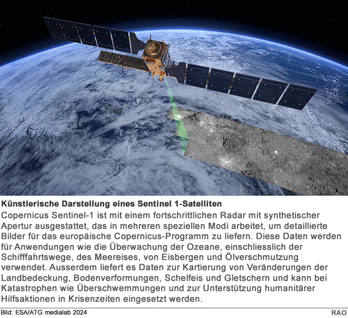 Darüber hinaus wird es häufig zur Beobachtung von Bodendeformationen durch Bodensenkungen, Erdbeben und vulkanische Aktivitäten sowie zur Kartierung von Wäldern, Wasser- und Bodenressourcen eingesetzt. Die Mission ist von entscheidender Bedeutung für die Unterstützung von humanitärer Hilfe und Kriseneinsätzen weltweit. Sentinel-1C und Sentinel-1D führen mit ihrem integrierten automatischen Identifizierungssystem (AIS) neue Fähigkeiten zur Erkennung und Überwachung des Seeverkehrs ein. Dieses System umfasst vier Bordantennen und optimiert die Erfassung von Signalen, die von Schiffen gesendet werden, einschliesslich entscheidender Details wie Schiffsidentität, Standort und Fahrtrichtung, um eine präzise Verfolgung zu ermöglichen. Sentinel-1-Daten sind über das Copernicus Data Space Ecosystem frei verfügbar und bieten sofortigen Zugriff auf eine Vielzahlvon Daten sowohl aus den Copernicus Sentinel-Missionen als auch aus den Copernicus Contributing Missions. Die Sentinel-1-Mission ist das Ergebnis einer engen Zusammenarbeit von ESA, der Europäischen Kommission, der Industrie, Dienstleistern und Datennutzern. Entworfen und gebaut von einem Konsortium aus mehr als 70 Unternehmen unter der Leitung von Thales Alenia Space und Airbus Defence and Space ist es ein hervorragendes Beispiel für Europas technologische Exzellenz.