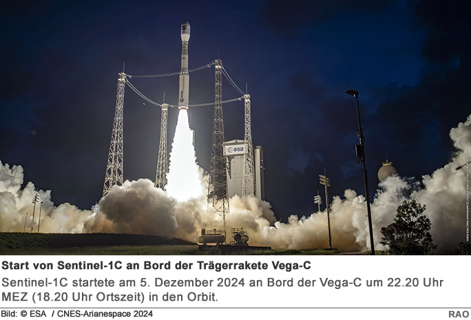 Sentinel-1C startete am 5. Dezember 2024 an Bord der Vega-C um 22.20 Uhr MEZ (18.20 Uhr Ortszeit) in den Orbit. Der Start verlief reibungslos, die Rakete erreichte den Weltraum in acht Minuten und setzte Sentinel-1C um ca. 00:04 Uhr MEZ ab.