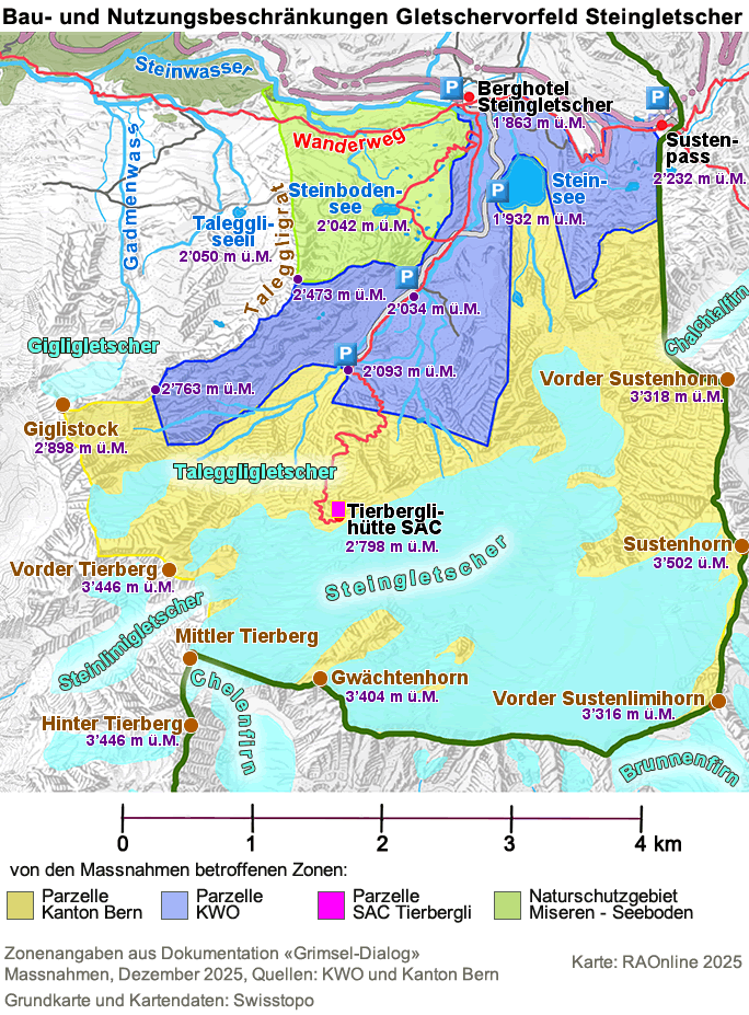 Bau- und Nutzungsbeschränkungen Gletschervorfeld Steingletscher am Sustenpass Ausgestaltung: Im Rahmen eines ausführlichen Begleitprozesses zwischen KWO, den Gemeinden Innertkirchen und Guttannen, Stiftung Landschaftsschutz Schweiz, Pro Natura Bern, Schweizer Alpen-Club und Aqua Viva hat man sich unter Wahrung diverser Interessen darauf geeinigt, das Gletschervorfeld des Steingletschers und dessen Umgebung (inkl. das Gebiet des Steilimigletschers) vor zukünftigen über das jetzige Ausmass hinausgehenden anthropogenen Nutzungen zu schützen.