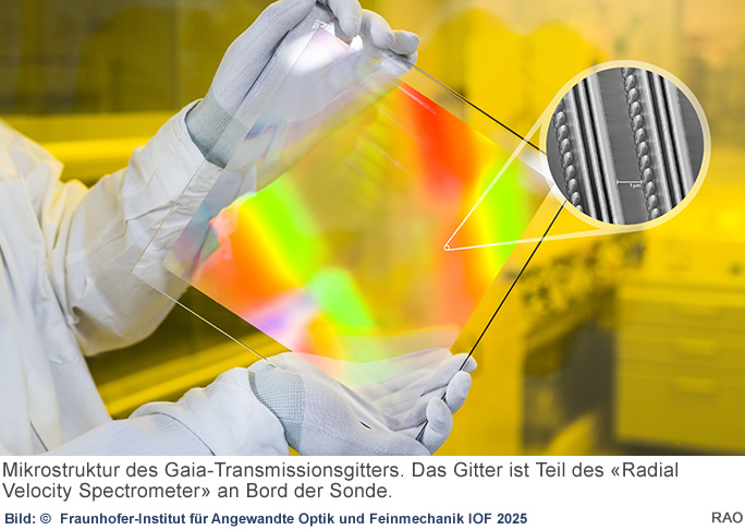 Drei Instrumente an Bord von Gaia ermöglichen die Kartographie der Milchstrasse. Eines davon ist das «Radial Velocity Spectrometer» (RVS), dessen Schlüsselkomponente, ein Transmissionsgitter zur Messung der Rotverschiebung, am Fraunhofer IOF entwickelt wurde.