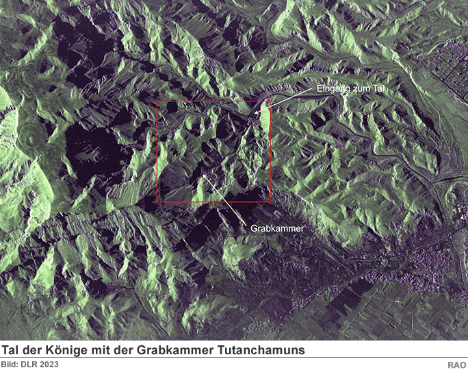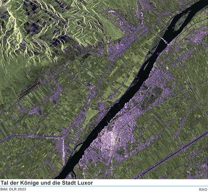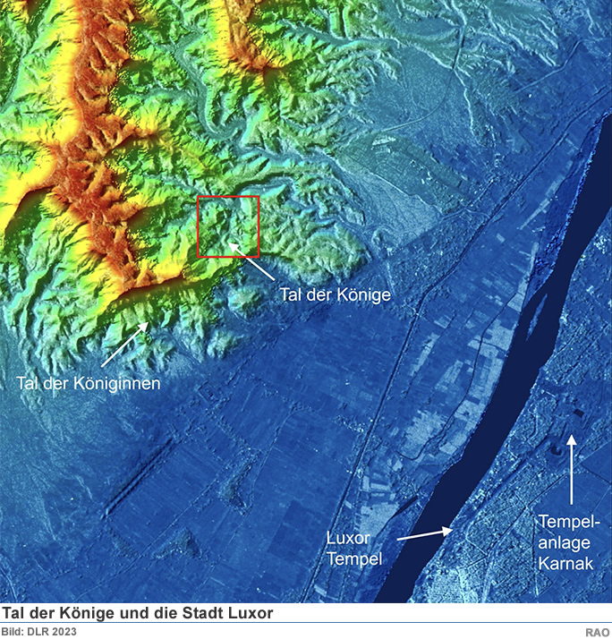 Das versteckt liegende Tal der Könige haben die Radarsatelliten TerraSAR-X und TanDEM-X nun auf beeindruckende Weise sichtbar gemacht. Die beiden Satelliten umkreisen die Erde, nur wenige hundert Meter entfernt voneinander, in 514 Kilometern Höhe. So können sie zeitgleich dasselbe Gebiet auf der Erde erfassen. Mithilfe der sogenannten SAR-Interferometrie können aus den Radardaten der Satelliten detailreiche Höhenmodelle von der Erde erstellt werden. Dabei sendet einer der beiden Satelliten Radarsignale aus. Die von der Erdoberfläche reflektierten Signal-Echos werden dann von beiden Satelliten aus zwei verschiedenen Blickwinkeln empfangen, ähnlich wie beim menschlichen Sehen. Aus den unterschiedlichen Weglängen der Signale vom Boden zu den Satelliten, dem Phasenunterschied, kann beim Überflug die Höhenänderung der Erdoberfläche gemessen werden. Aus den Daten hat das DLR-Team ein digitales Höhenmodell des Tals der Könige erstellt. In flachen Gebieten ergänzten sie ausserdem die von den Satelliten gemessene Rückstreuung der Erdoberfläche, um dort beispielsweise Städte besser sichtbar zu machen. Zur anschaulicheren Darstellung wurde das Modell zusätzlich eingefärbt.