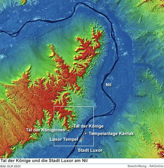 Die Aufnahmen der Radarsatelliten zeigen ein digitales Höhenmodell (Digital Elevation Model, DEM) des Niltals in verschiedenen Vergrösserungsstufen. Mit zunehmender Vergrösserung kommen immer neue fraktale Strukturen und Details der bergigen Region und des Niltals zum Vorschein. Das Tal der Könige selbst erstreckt sich über ein sehr kleines Areal von lediglich einem Quadratkilometer und wird erst in der höchsten Vergrösserungsstufe deutlich sichtbar. Es liegt westlich des Nils, in den südlichen Ausläufern des stark zerklüfteten Felsmassivs der Thebaner Berge. Der höchste Punkt der Thebanischen Berge ist der pyramidal anmutende El-Qurn . An seinem Ende befinden sich die insgesamt 64 Grabkammern der Pharaonen - unter ihnen auch "KV62" (King's Valley), die Grabkammer Tutanchamuns. Am südlichen Berghang des El-Qurn liegt das Tal der Königinnen sowie der prunkvolle Totentempel der altägyptischen Königin Hatschepsut.