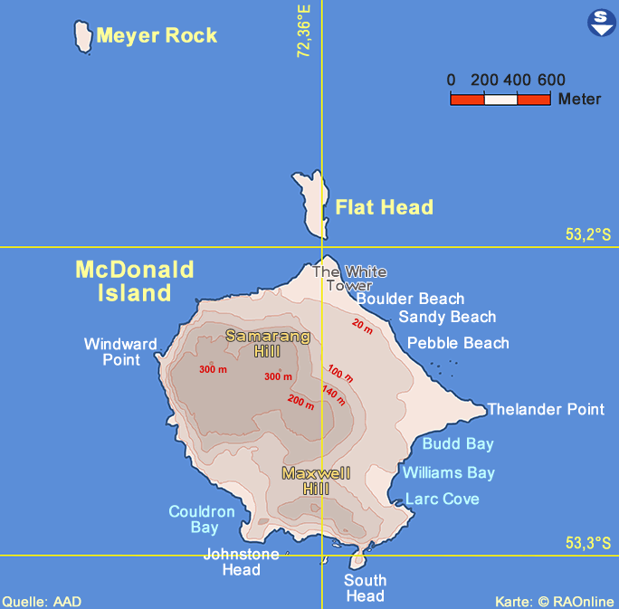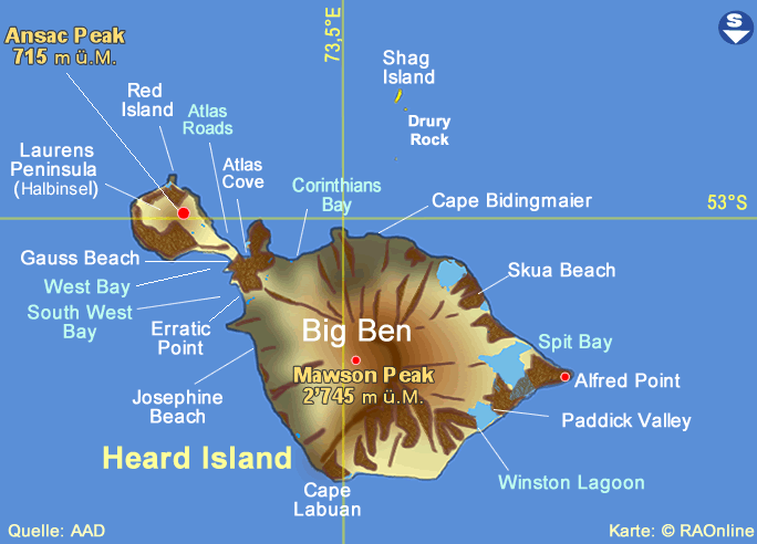 (Big Ben) und einem aktiven Vulkan (Mawson Peak, höchster Punk 2'745 m)
