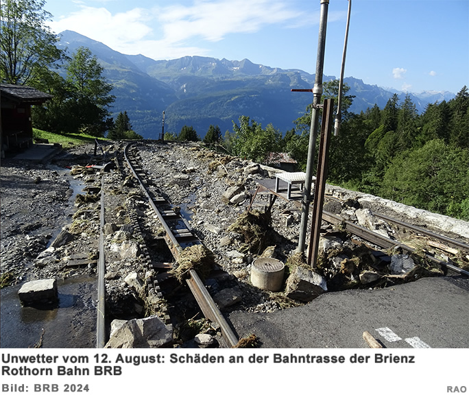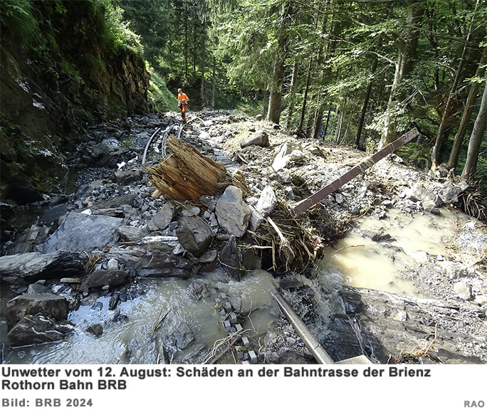 Die Regen-und Gewitterzelle, die am Montagabend, 12. August 2024, über dem Dorf Brienz BE niederging, hat die Brienz Rothorn Bahn BRB hart getroffen. Die verursachten Schäden sind so gross, dass der Bahnbetrieb bis zum vorgesehenen Saisonende nicht mehr aufgenommen werden kann. Ab sofort bleibt er eingestellt. Vorläufig wird mit Kosten von CHF 5 Mio. gerechnet.