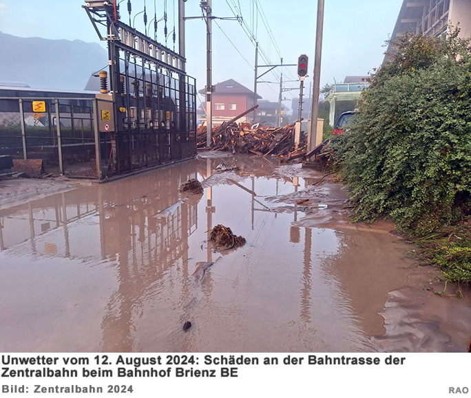 Die Zentralbahn wurde vom Unwetter am 12. August 2024 stark getroffen. Die Schäden an der Infrastruktur sind gross. Es wird mit einem Unterbruch von mehreren Wochen gerechnet, um die Fahrbahn wieder instand zu setzen. Ein Bahnersatz ist eingerichtet. Aufgrund der erheblichen Auswirkungen auf die Kunden und die Infrastruktur wurde der Notfallstab einberufen. Die Situation wird aufgrund der instabilen Wettervorhersage als labil eingeschätzt.