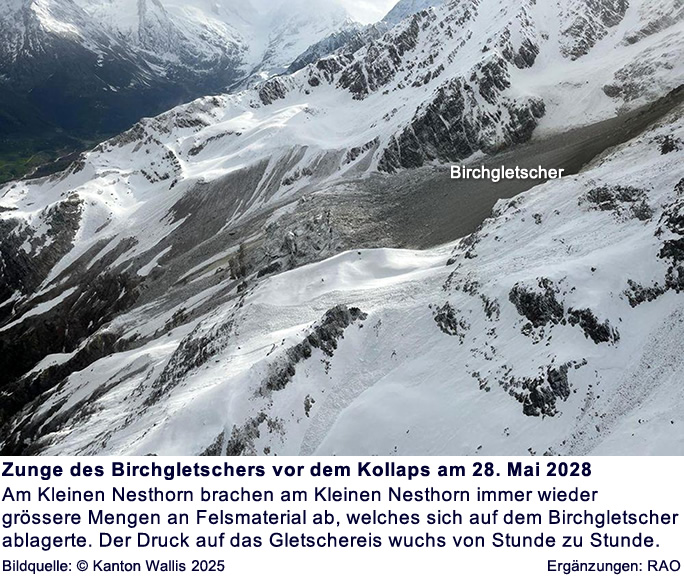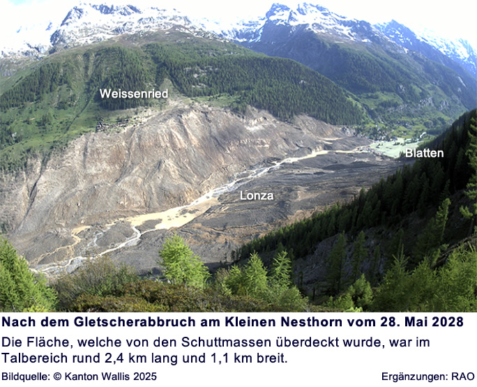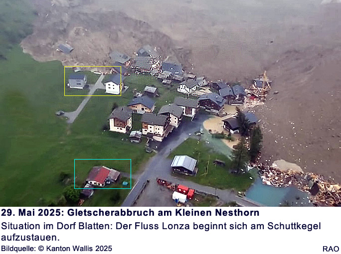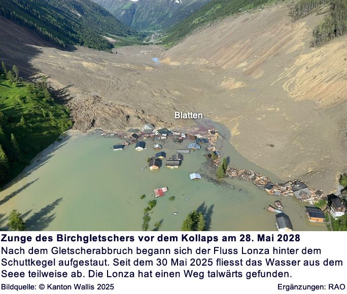 29. Mai 2025, 11:30 Uhr Nahezu der gesamte Birchgletscher oberhalb von Blatten im Lötschental ist abgebrochen und hat einen gewaltigen Bergsturz ausgelöst. Die dadurch im Talboden entstandene, mehrere Dutzend Meter dicke und rund zwei Kilometer lange Eis- un Geröllablagerung hat den Grossteil des Dorfes Blatten verschüttet. Die Schäden sind erheblich. Das Absturzmaterial blockiert den Abfluss der Lonza, wodurch sich ein See zu bilden beginnt. Die zentrale Gefahr liegt darin, wie sich das aufgestaute Wasser der Lonza verhält - bei einem Überlauf über das Ablagerungsgebiet könnte eine Murganglawine ausgelöst werden. Derzeit wird eine Person vermisst. Für den Einsatz vor Ort werden erhebliche Kräfte aufgeboten. Die Armee ist vor Ort, um sich ein erstes zu machen, und steht bereit, um weitere Ressourcen zu mobilisieren. Auch der Zivilschutz ist im Einsatz. Die Bevölkerung aufgefordert, den Anweisungen der Behörden dringend Folge zu leisten und das betroffene Gebiet nicht zu betreten. Das Führungsorgan (KFO) analysiert die Situation laufend. Der Kanton Wallis verspricht, alle verfügbaren Mittel einzusetzen betroffene Bevölkerung bestmöglich zu unterstützen. Der Grossteil des Birchgletschers sowie der darüber liegende Schuttkegel oberhalb von Blatten sind eingebrochen. Am Talgrund hat die durch den Gletscherabbruch entstandene, mehrere Dutzend Meter dicke und rund zwei Kilometer lange Eis- und Geröllmasse einen erheblichen Teil des Dorfes verschüttet. Eine Person wird vermisst. Infolge der Schuttmengen wurde der Abfluss der Lonza blockiert, wodurch sich ein See bildet, der die bisher unversehrten Gebäude überflutet. Im Fokus steht das potenzielle Abflussverhalten von Wasser und Lonza, da ein Überlauf einen Murgang auslösen könnte. Zu diesem Zweck wurde die Speicherkapazität des weiter talwärts liegenden Stauwerks von Ferden erhöht. Im Rahmen von Vorsorgemassnahmen wurden einige Gebäude in den Gemeinden Wiler und Kippel evakuiert.